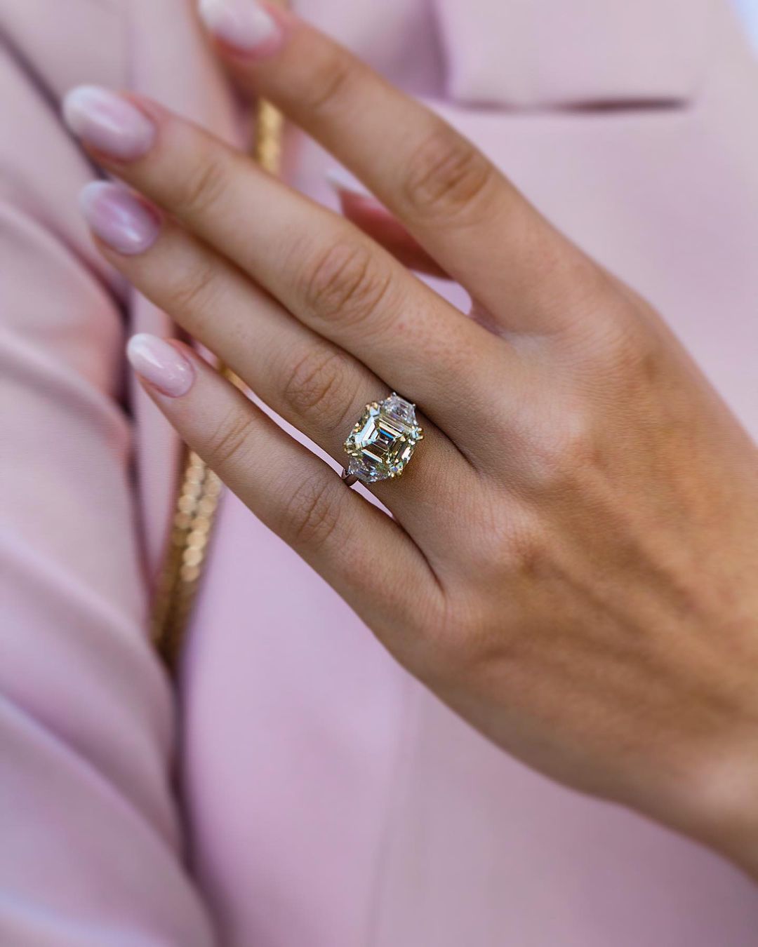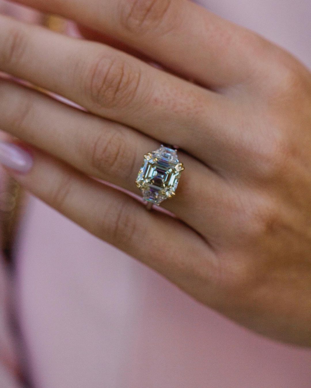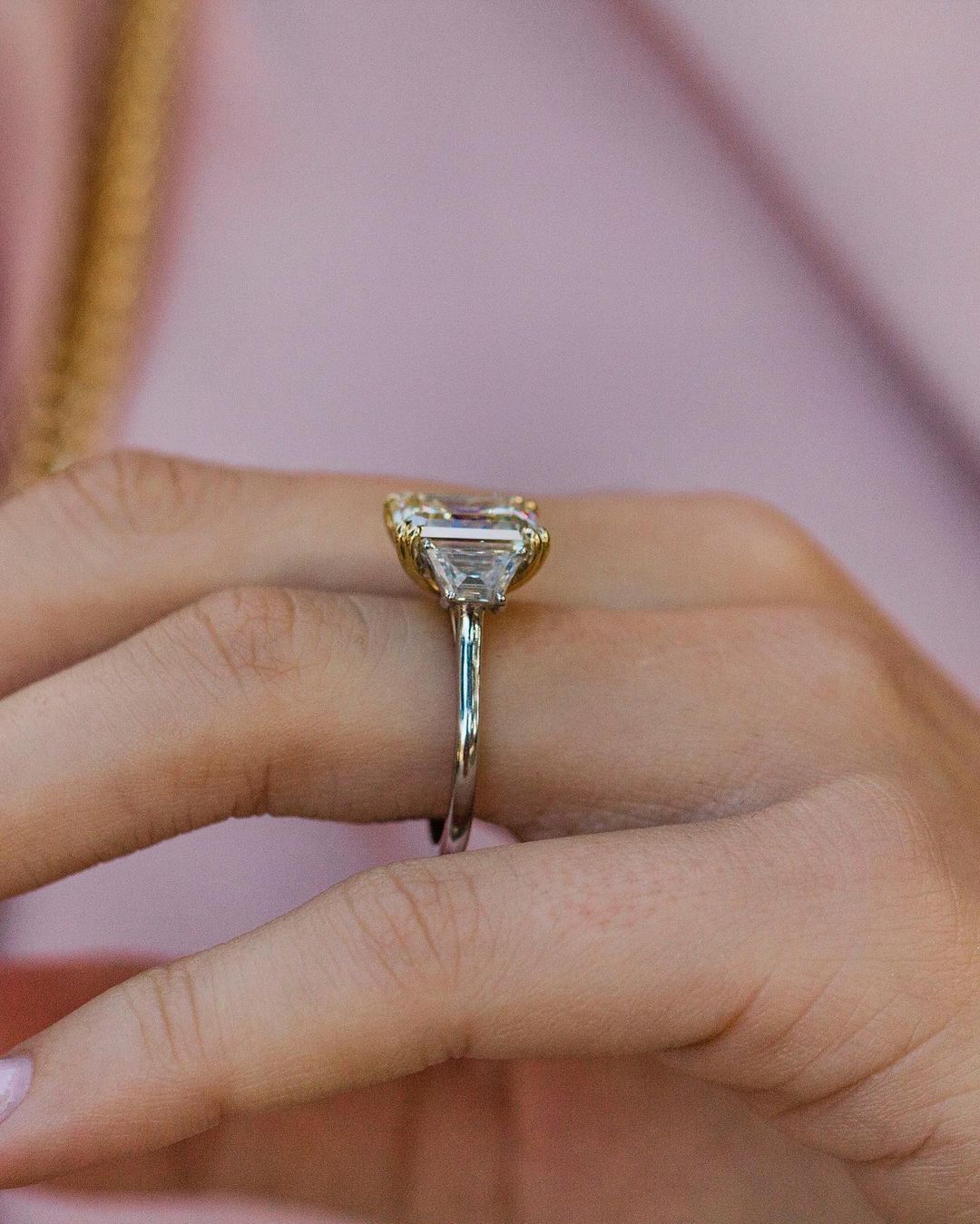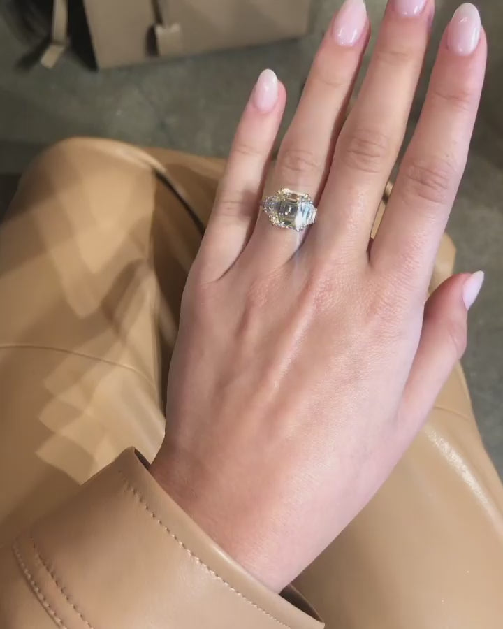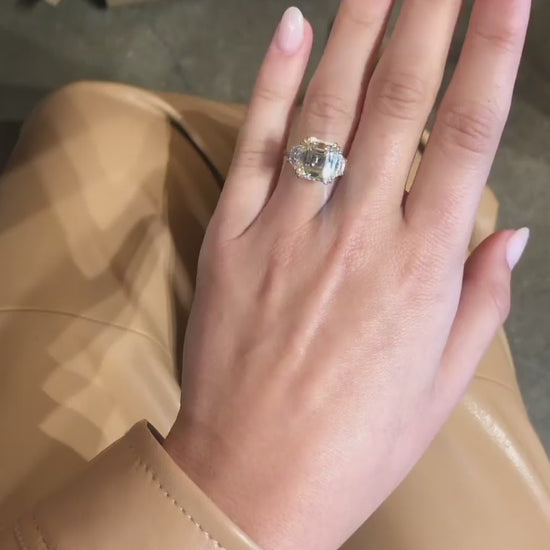 - 10.5x9.5mm asscher cut canary Natural center with two mid flanking mid trap side stones set in a two-tone 18k white and yellow gold setting
