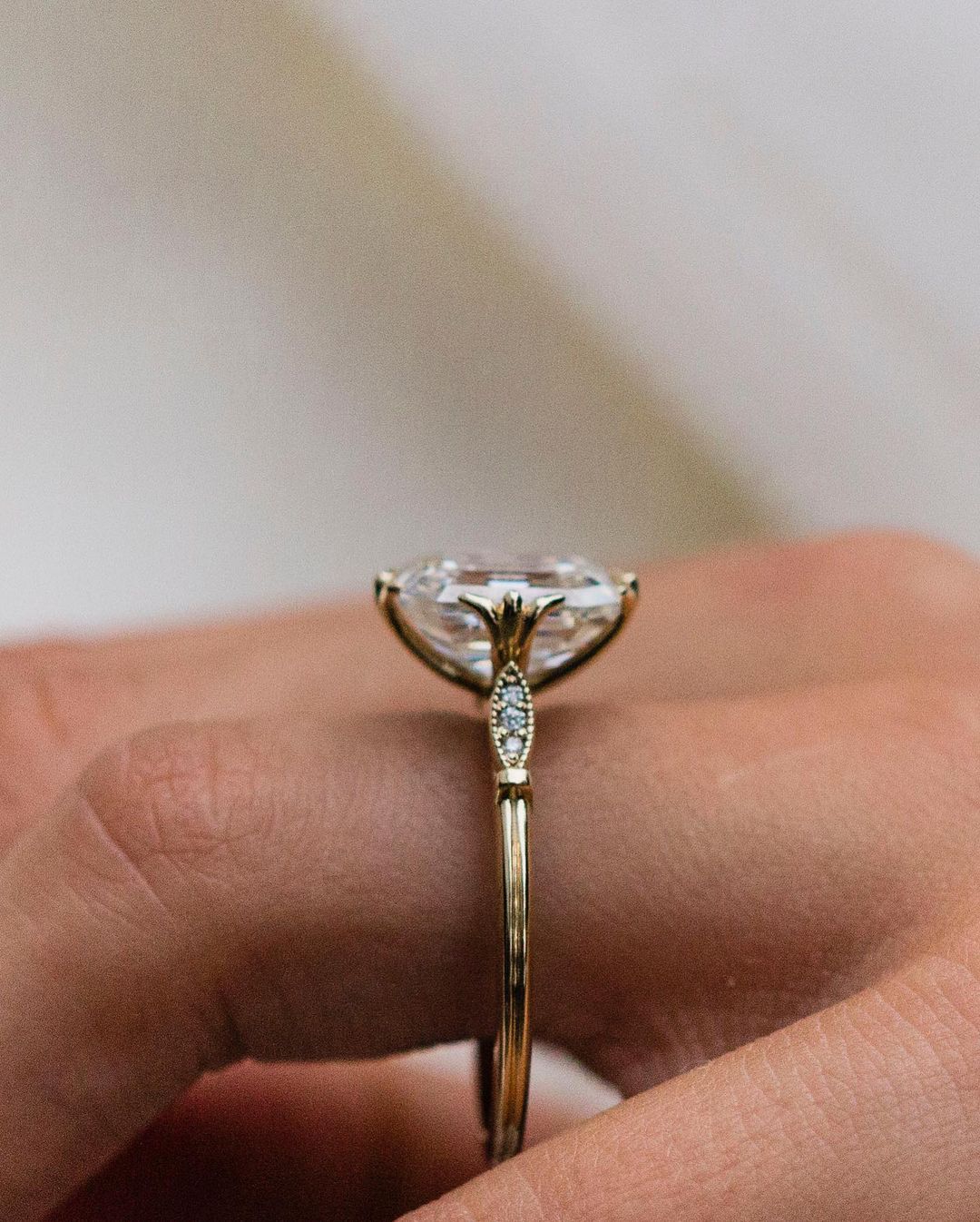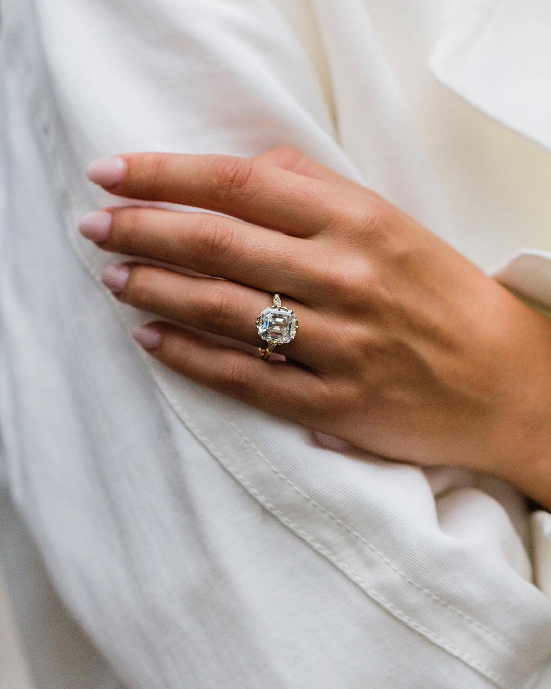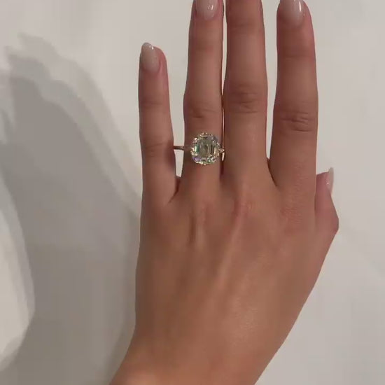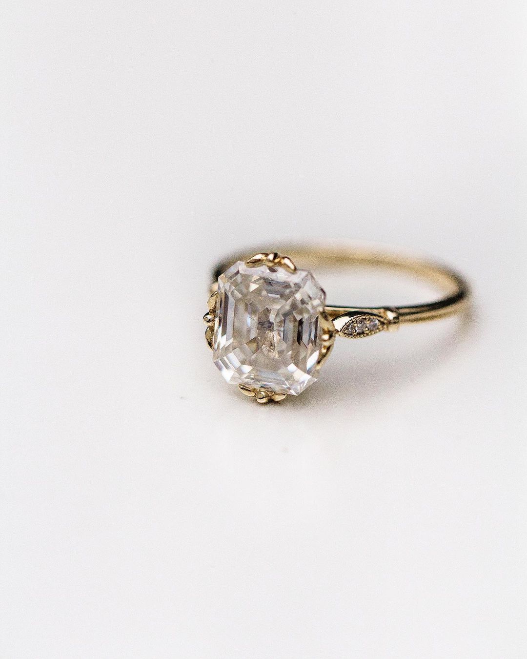 - 6.5 carat old mine asscher cut, vintage white center set in a 14k yellow gold setting